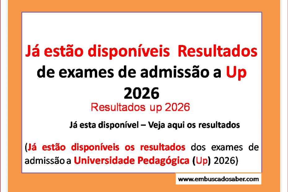 Resultados dos Exames de Admissão da UP 2026 Os resultados dos exames de admissão à Universidade Pedagógica (UP) para o ano lectivo de 2026 já se encontram disponíveis para consulta. Os exames de admissão da UP para o ano lectivo… Resultados up 2026 (Já estão disponíveis)