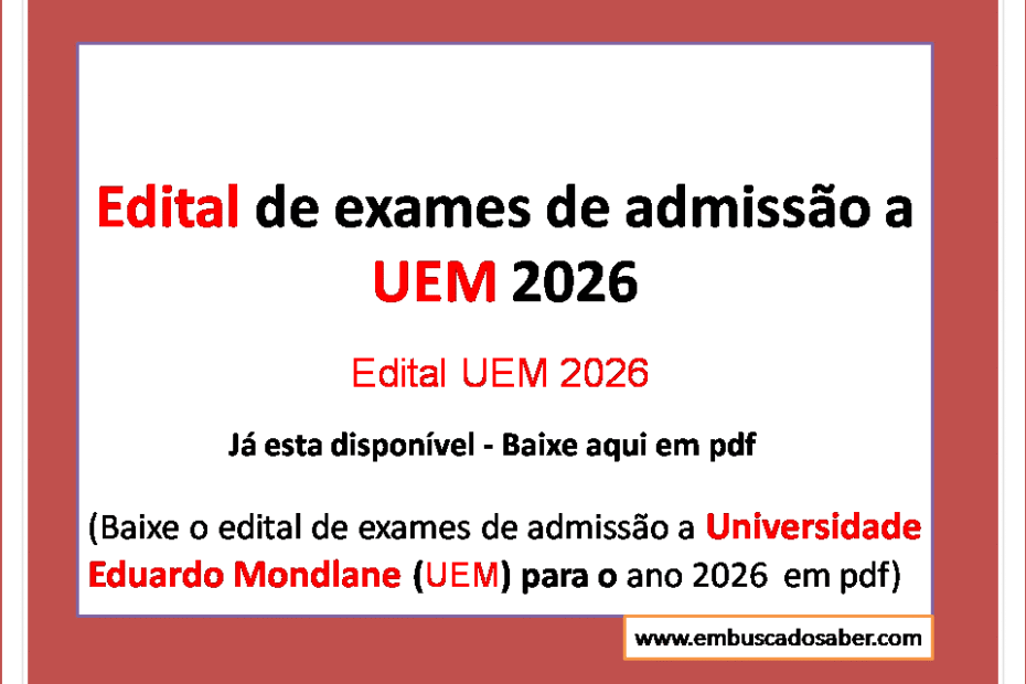 O Edital de exames de admissão a Universidade Eduardo Mondlane para o ano lectivo de 2026 já está disponível e Você pode baixar aqui no formado de pdf. Qual é o período de candidatura ao exames de admissão UEM 2024 O período de candidatura… Edital UEM 2026