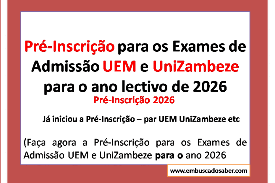 Edital de exames de admissão a UniZambeze 2026 Já esta disponível o edital de exames admissão a UniZambeze para o ano lectivo de 2026, pode fazer o download aqui nessa publicação, para o ano lectivo de 2026 estão disponível 2345 vagas, em… Edital da UniZambeze 2026