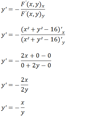 Para calcular a derivada da função implícita x²+y²=16 primeiro devemos colocar a função na forma F(x,y)=0 faremos isso passando o 16 para o primeiro metro depois disso é so usar a formula que vimos acima.