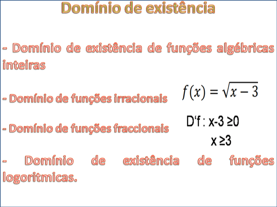 Domínio de existência de uma função f(x) ou expressão representa o conjunto de favores “x” na qual a função esta definida, ou seja são os valores que a variável x pode assumir.