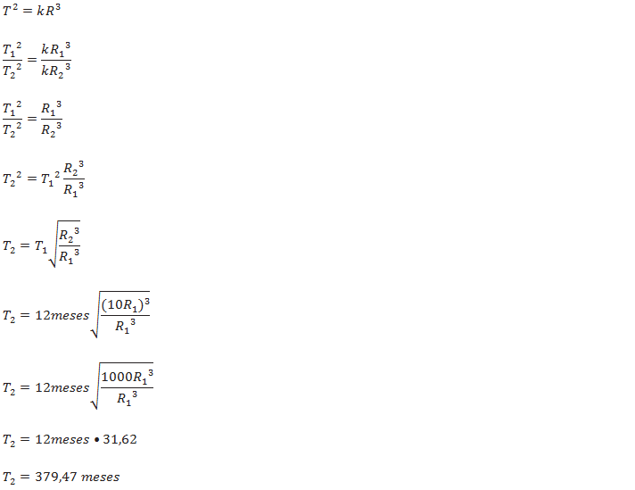 1.De quantos anos seria o período de um planeta girando em torno do sol, se sua distancia ao centro de gravitação fosse 10 vezes a distancia que a da terra ate sol